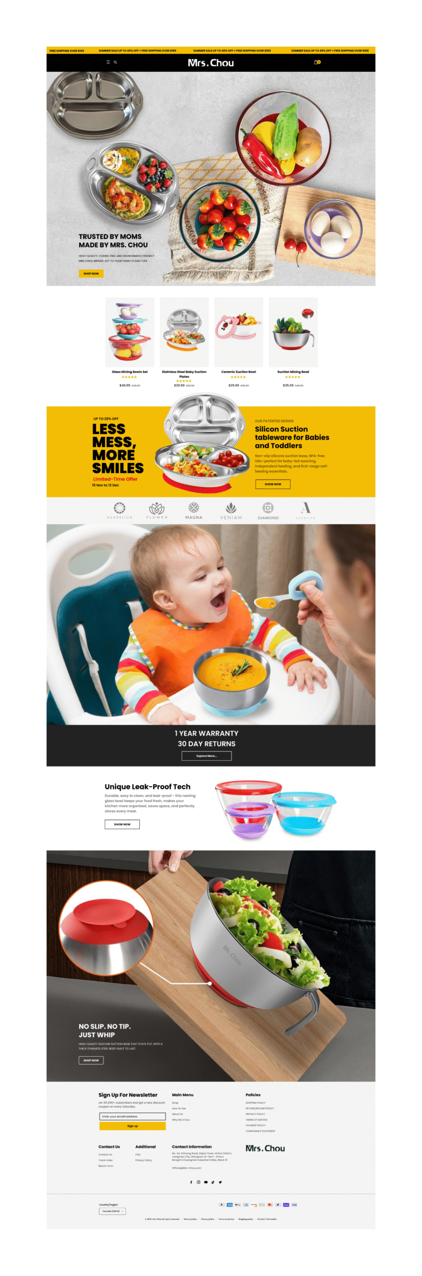 Mrs. Chou is a high-quality kitchenware brand specializing in stainless steel baby plates and bowls with silicone bases, alongside versatile storage and mixing bowls. The brand’s mission is to make cooking and feeding easier while ensuring safety, durability, and style. Mrs. Chou needed an e-commerce website that not only showcases their products beautifully but also drives online sales globally.